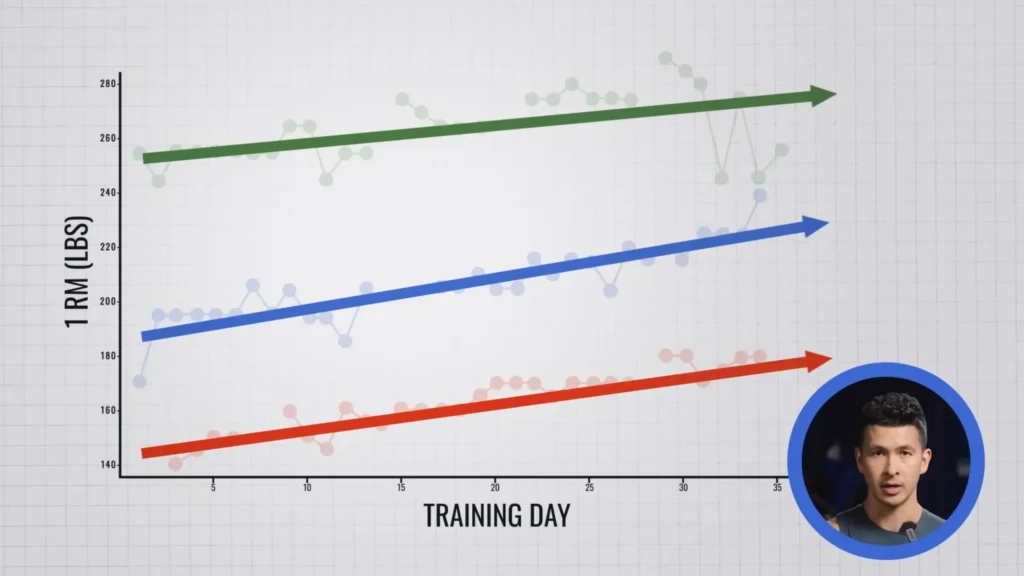 That was concerning — but when I looked closer at the daily bench press study we talked about earlier, some days the lifters got stronger, some days weaker, and some days stayed the same. But by the end, all of them were significantly stronger than when they started.