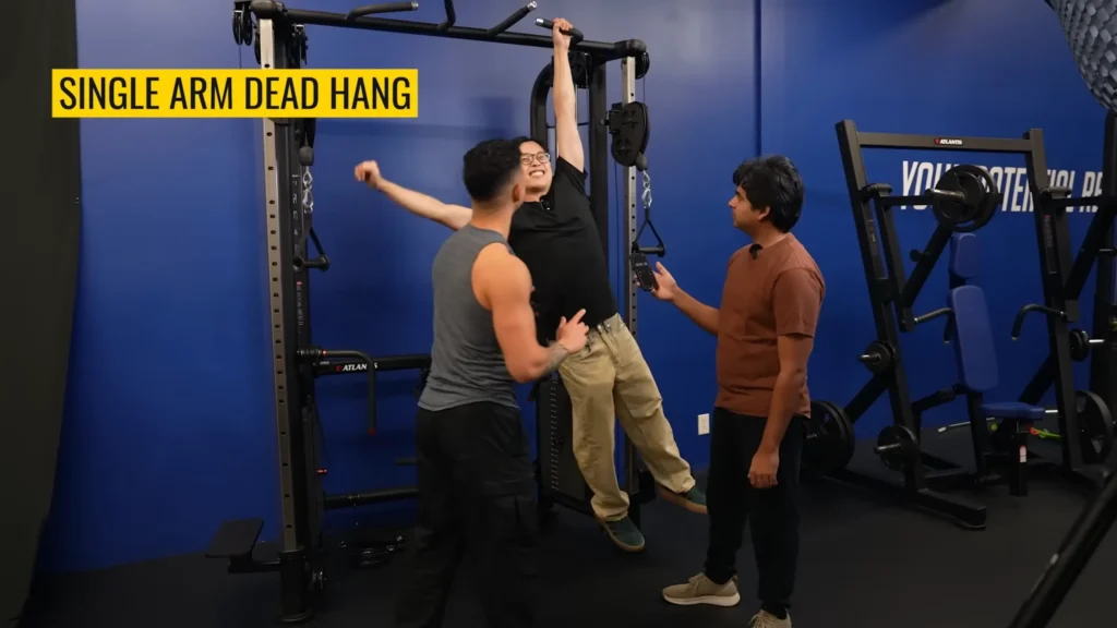 Usually the test is carrying 100% of your bodyweight for 30 seconds — but since we were doing one arm, we used 50%.