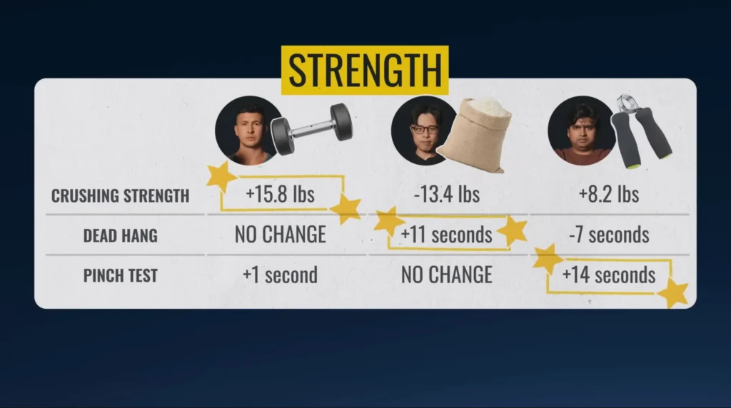 - Hand gripper: biggest pinch improvement (+14 seconds) + biggest mid/lower forearm growth